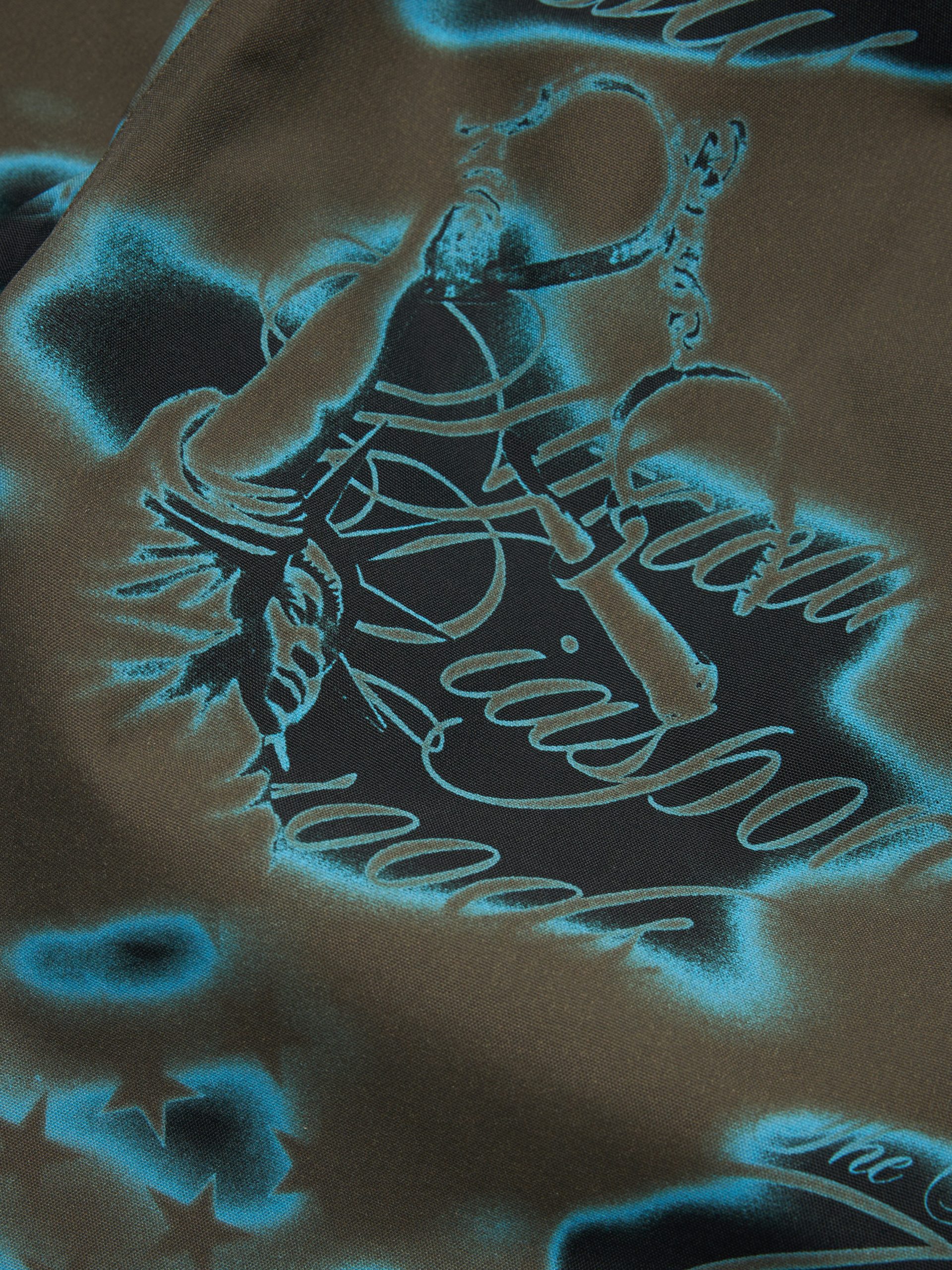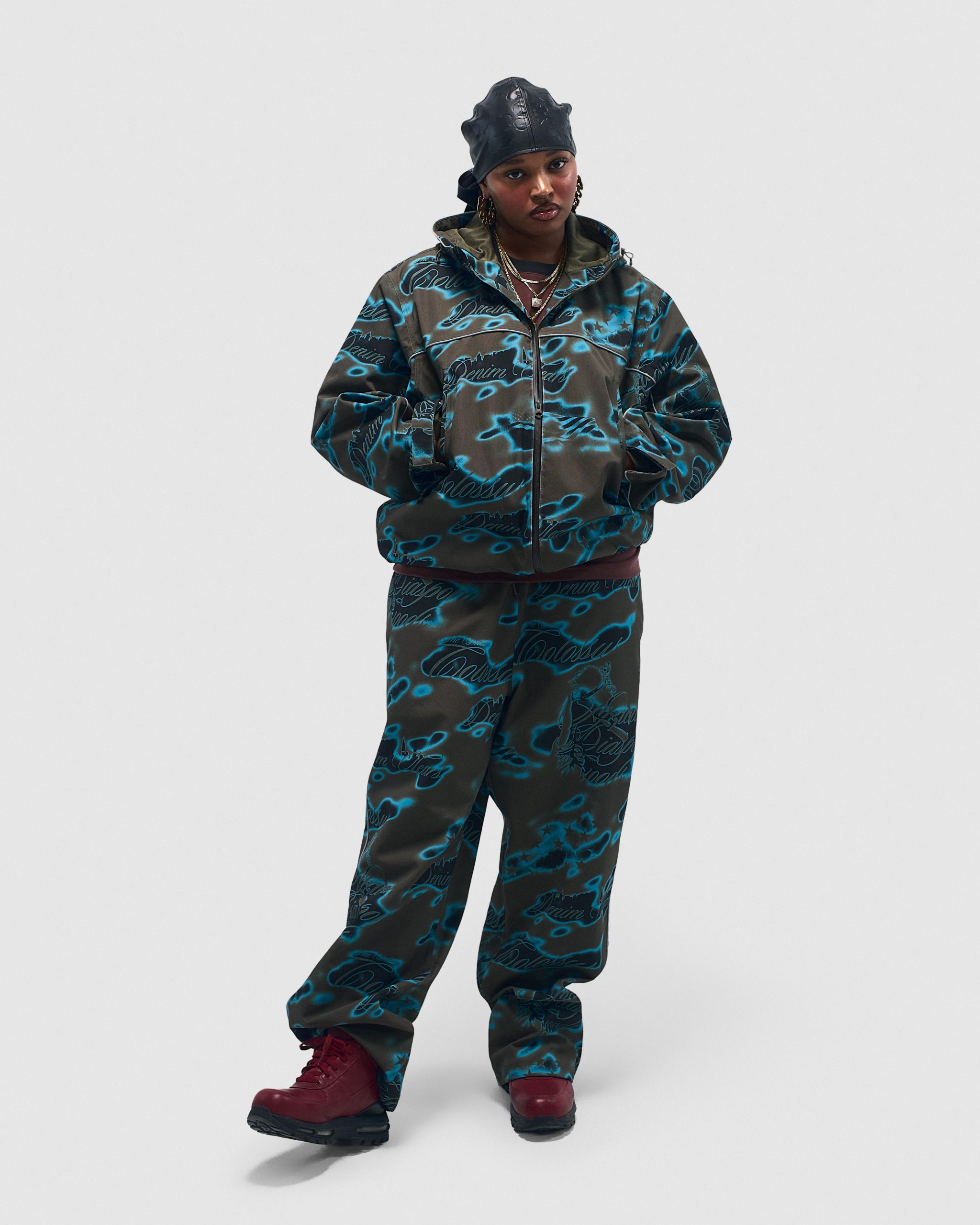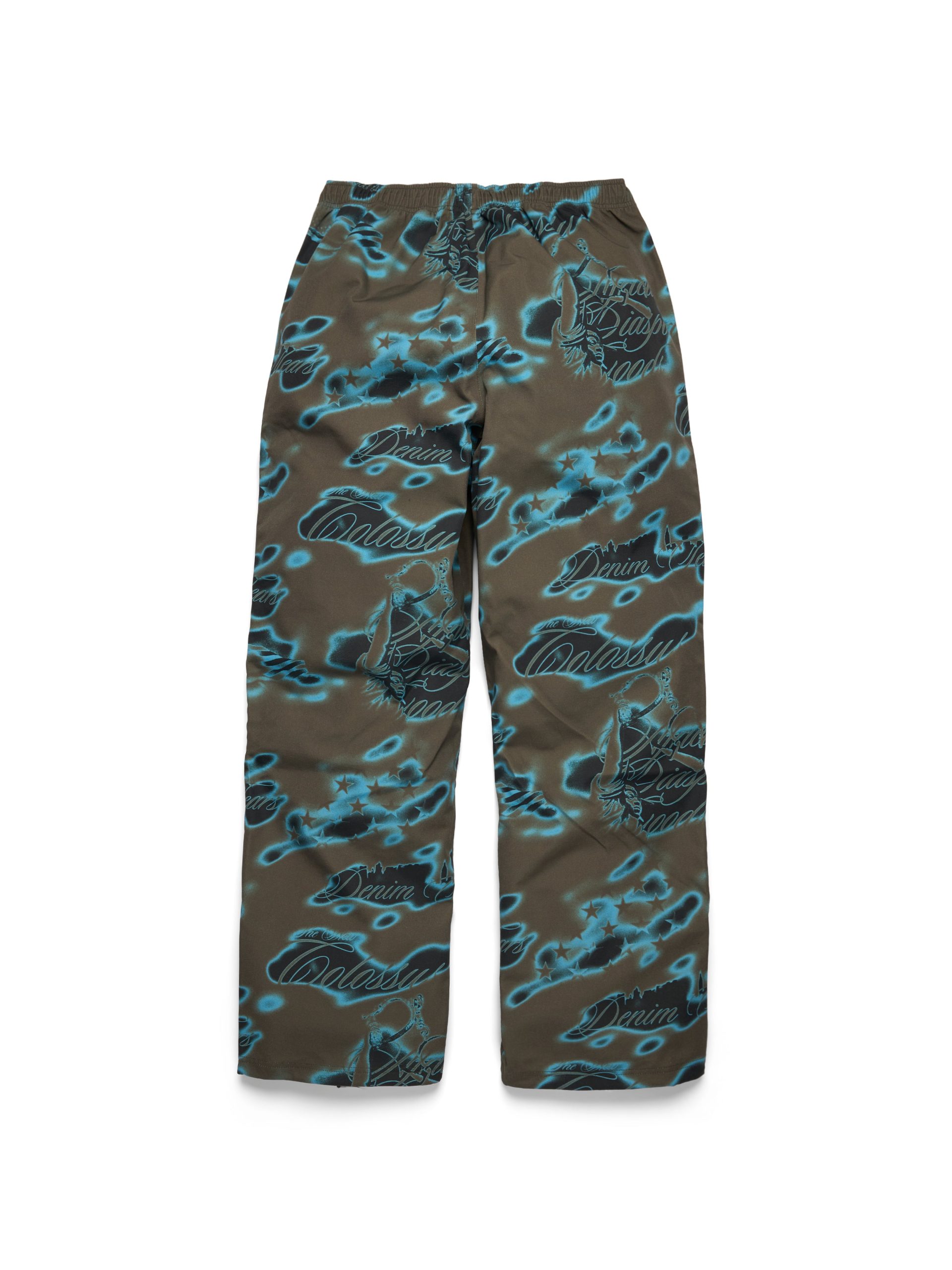 Constructed from a water-resistant 100% Nylon shell, our Cloud Camo Taped Seam Shell Pants feature taped seams and reflective 3M piping. and full Cloud Camo airbrushed print: a graphic amalgamation of key ‘Libertas’ motifs, including the US flag, African Diaspora Goods, and New Colossal.