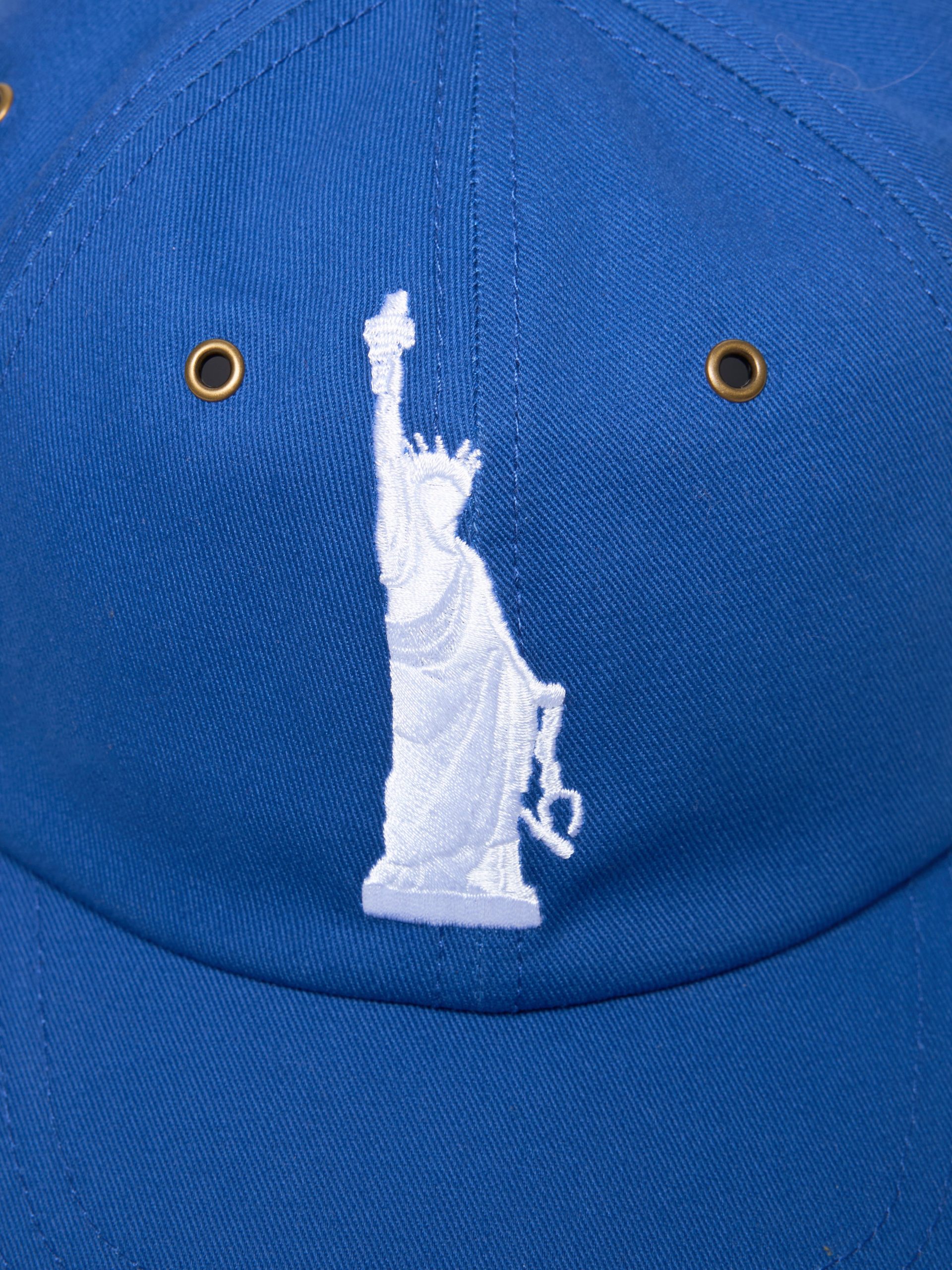 Produced in 100% cotton, our Libertas 1886 Cap features a six-panel construction and a belted strap. Finished with embroidered ‘Libertas’ motifs of 1886 – the year of the statue’s dedication – and Lady Liberty. In her left hand, she holds shackles, as originally intended by sculptor Frédéric-Auguste Bartholdi to commemorate the end of slavery; a monument intentionally built to celebrate emancipation, relocated to her feet and obscured before completion following American funders’ rejection of Bartholdi’s vision.