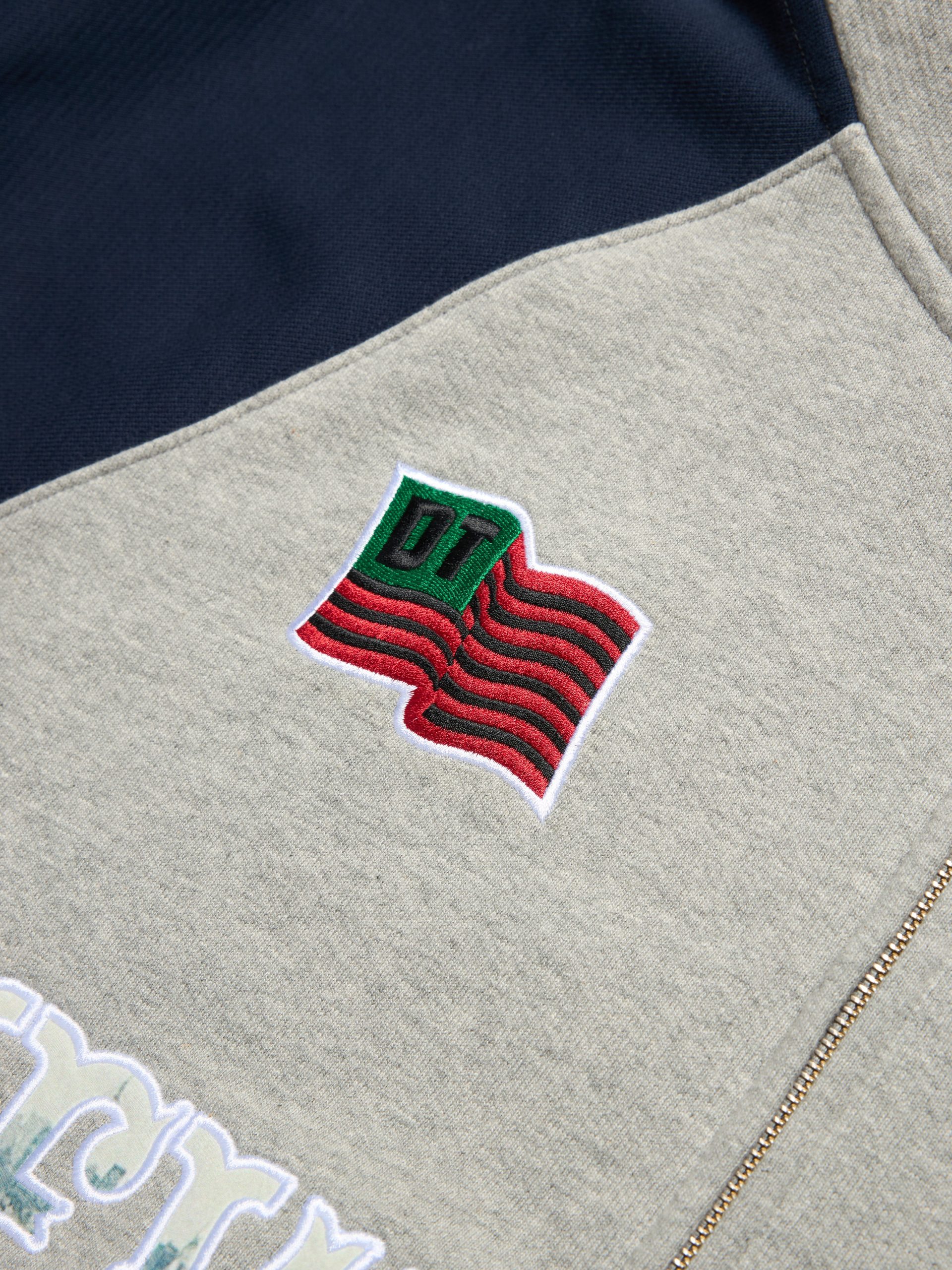 Constructed in 100% cotton to a regular fit with raglan sleeves, our Rugby Zip Hoodie is embellished with a photo appliqué displaying a view of the Statue of Liberty and New York City skyline and chenille patches, including the Pan-African flag.