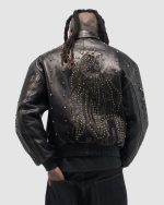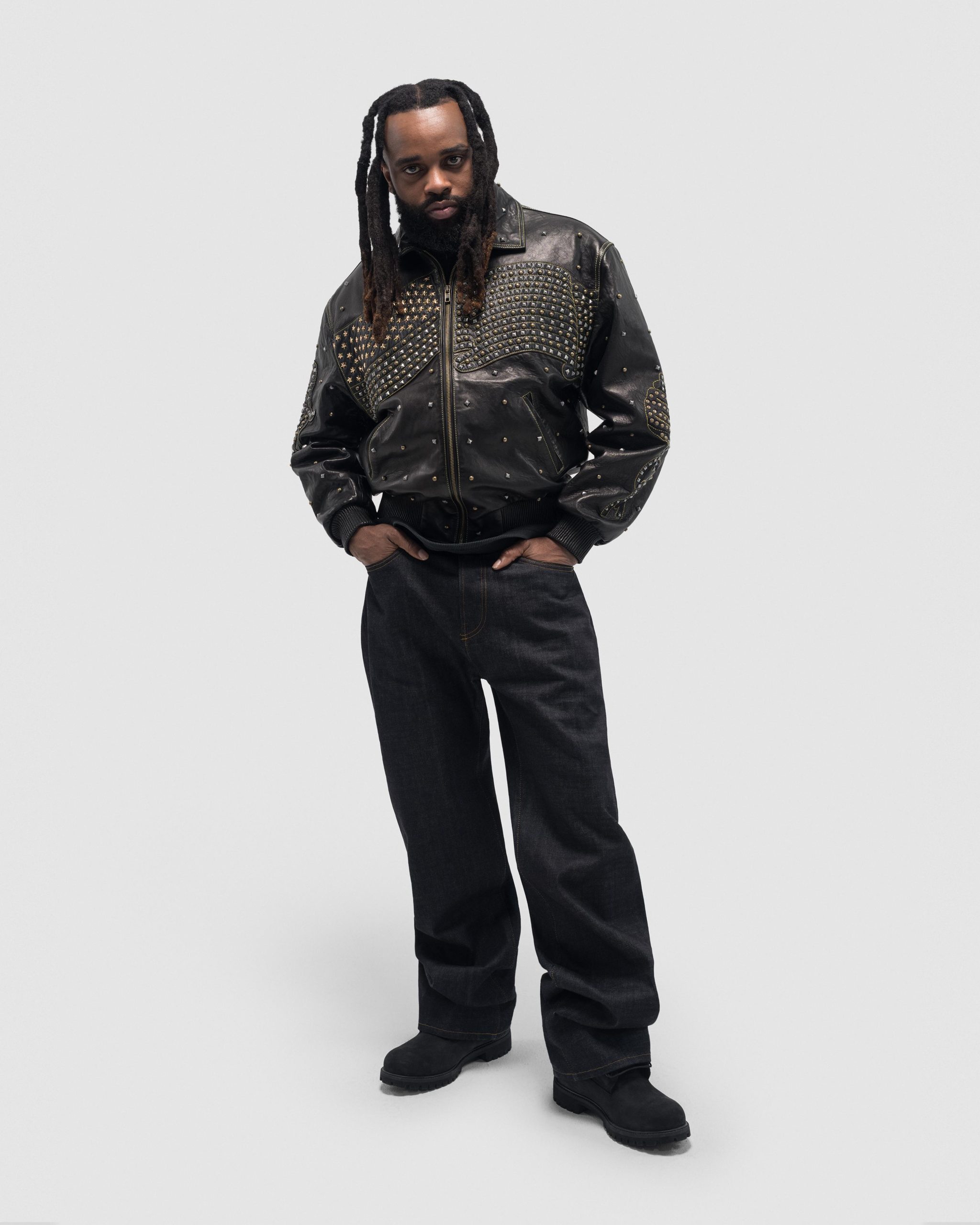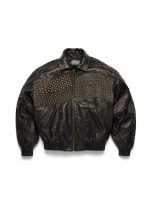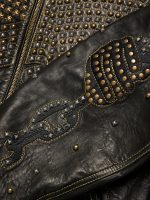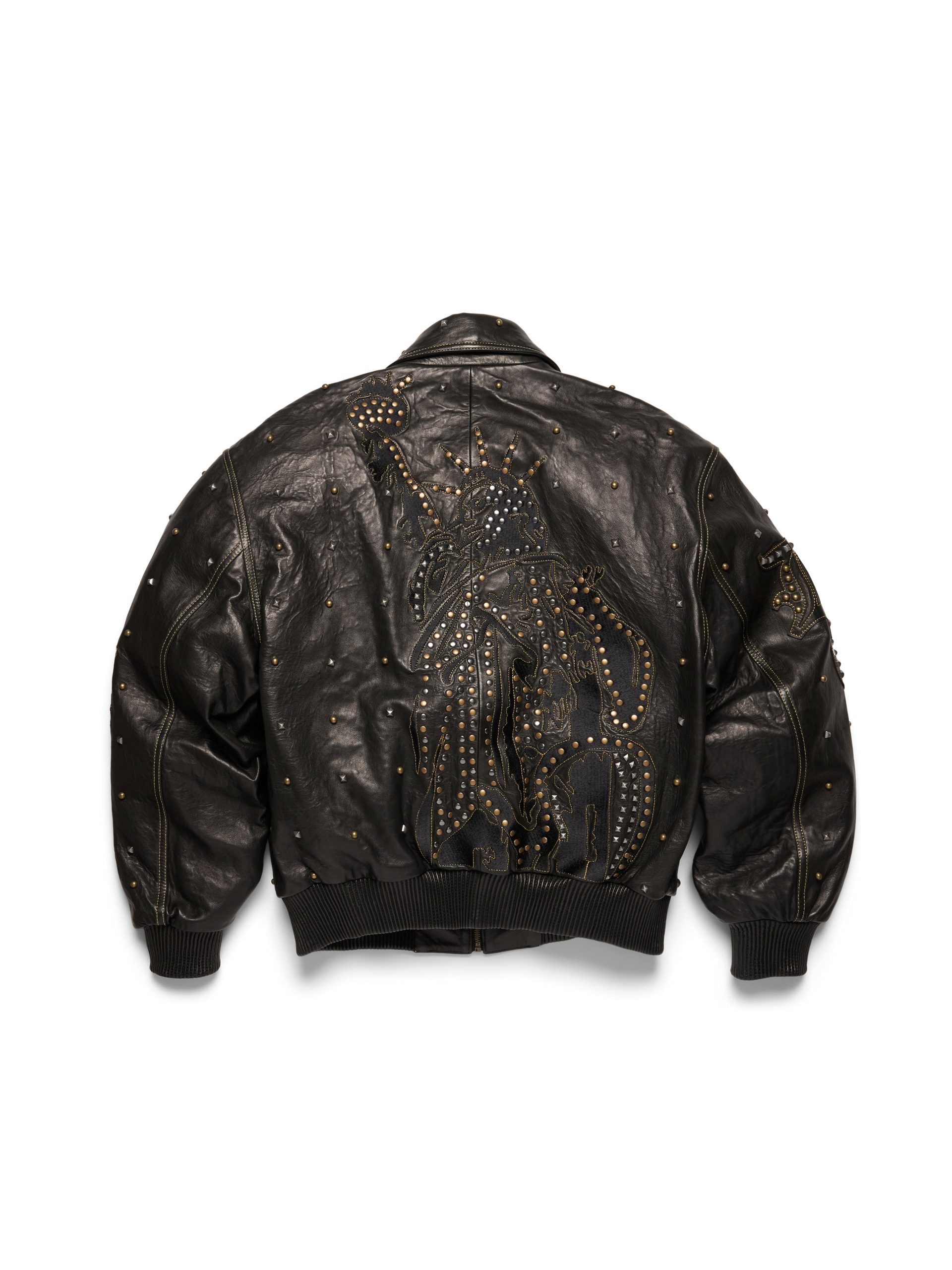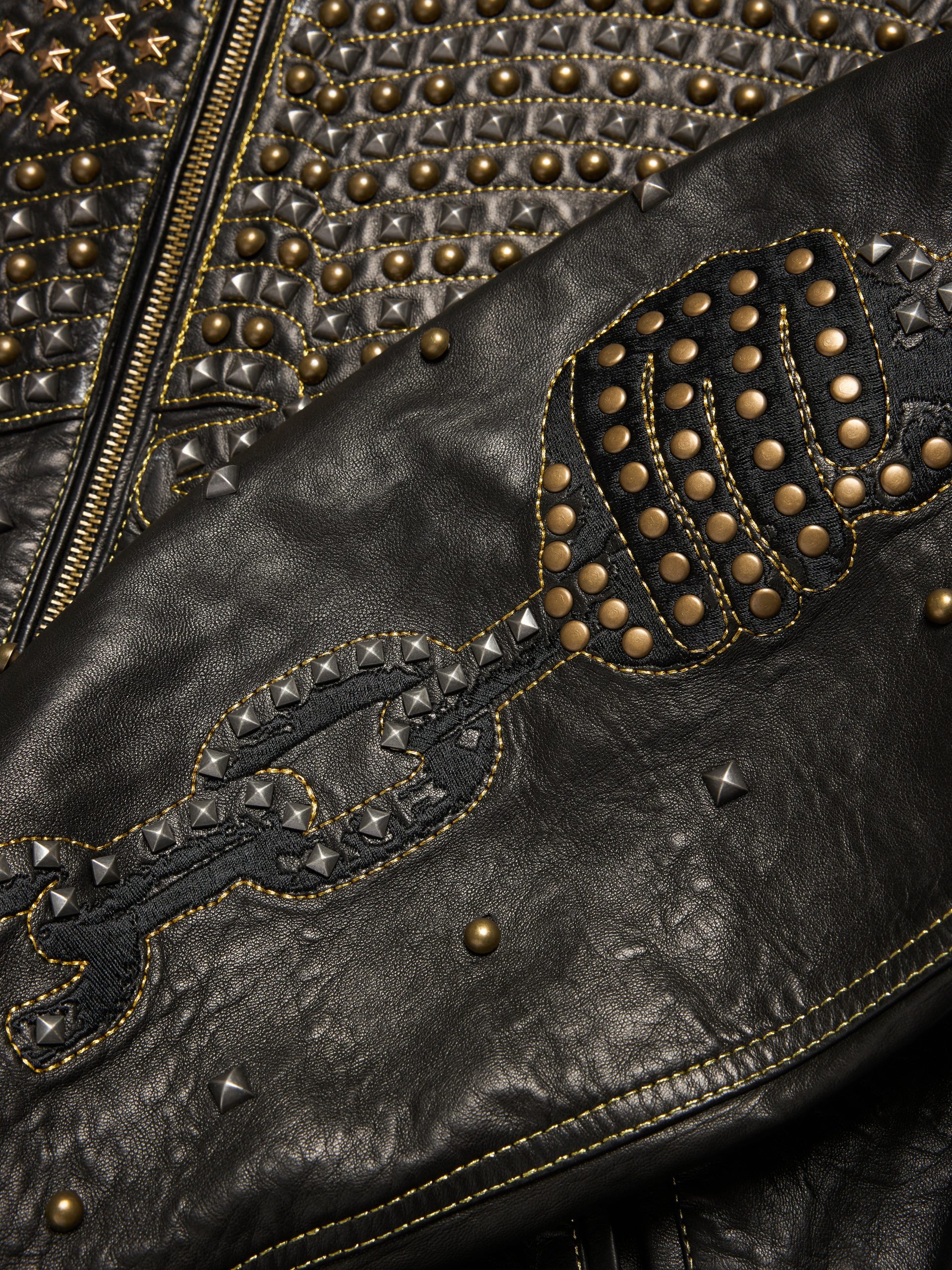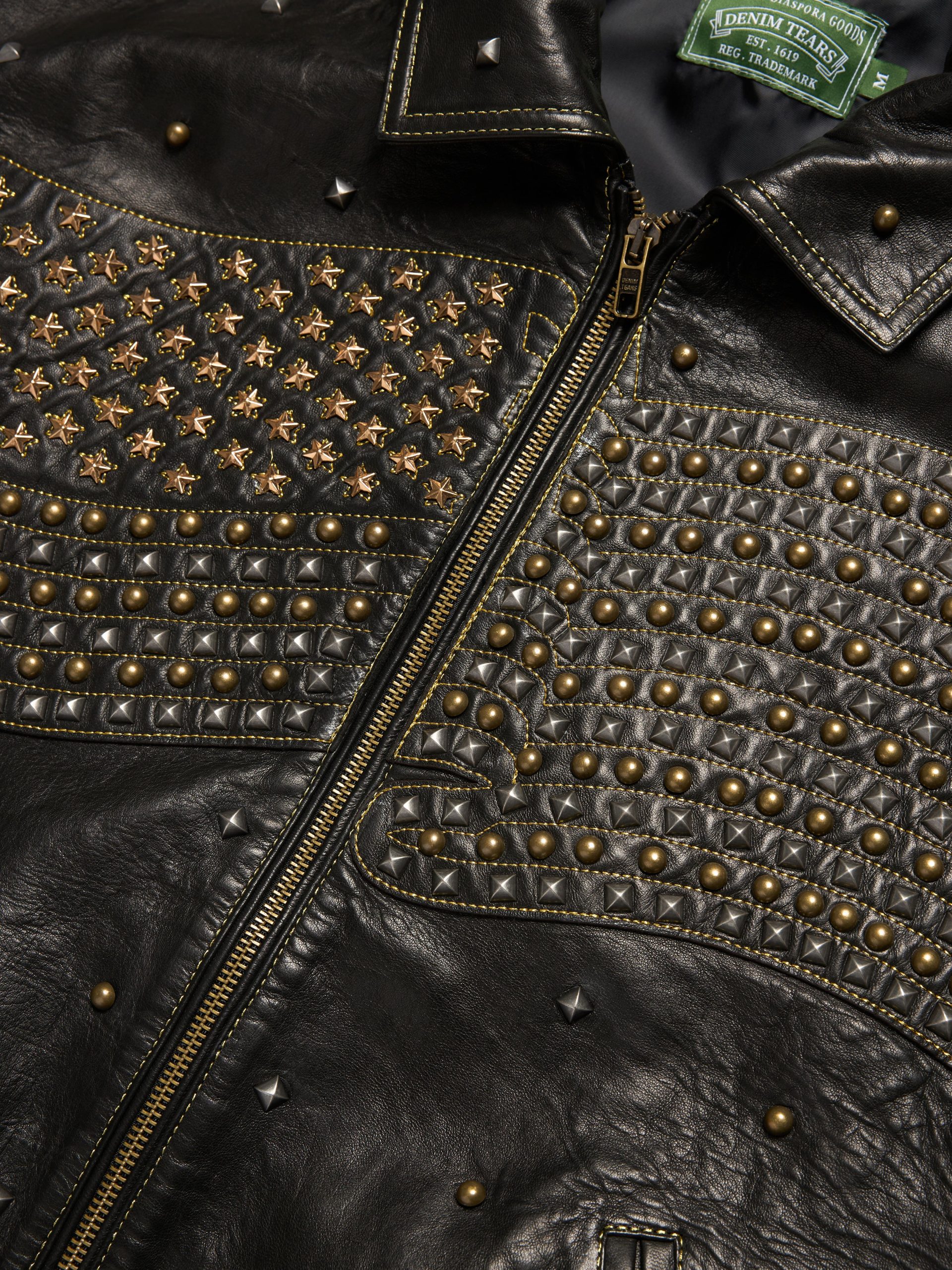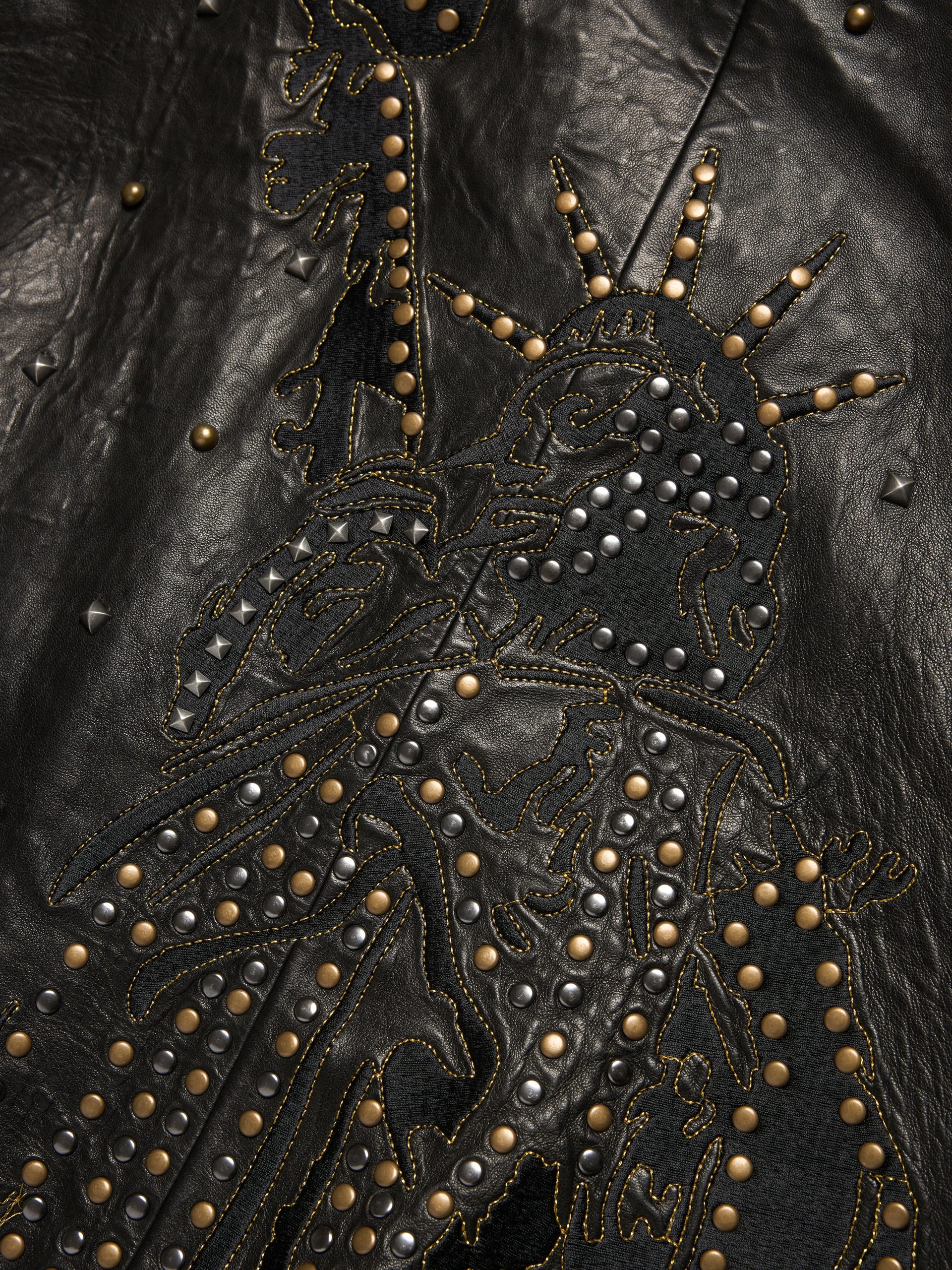 Produced in 100% leather and cut to a regular fit, our Libertas Studded Leather Jacket features statement brass and oxidized stud appliqué throughout. On the sleeves, the studs form a DT motif; on the chest, the US flag, while Lady Liberty fills the back. Finished with gold contrast embroidery.